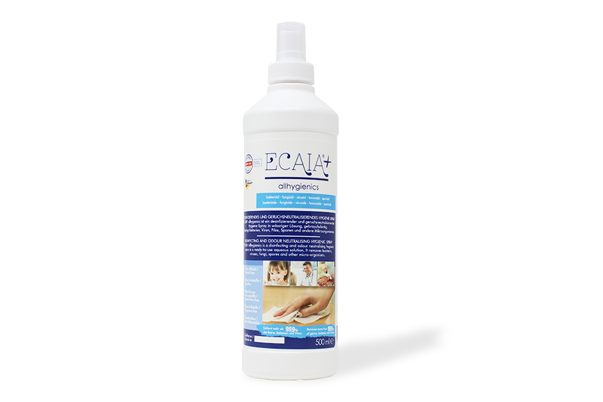 ECAIA+ allhygienics ist ein Reinigungsmittel, das Gerüche neutralisiert und in vielen Anwendungsbereichen eingesetzt werden kann. Das Produkt kann gesprüht oder mit einem trockenen Tuch aufgetragen werden.